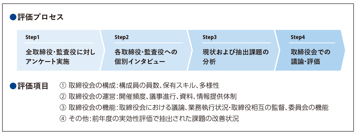 当社取締役会は、取締役会全体としての実効性に関する分析・評価のため、取締役および監査役にアンケートおよびインタビューを実施し、その結果に基づいて取締役会において議論を行いました。その現状の認識を共有するとともに、課題の抽出と取締役会の機能発揮に資する取り組みを通じて、継続的に取締役会の実効性の向上を図ってまいります。