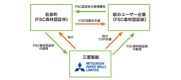 FSC森林認証紙のユーザー企業が認証林管理費用の一部を岩泉町に提供し、岩泉町が環境および経済的に豊かな森をつくることを三菱製紙株式会社が支援します。